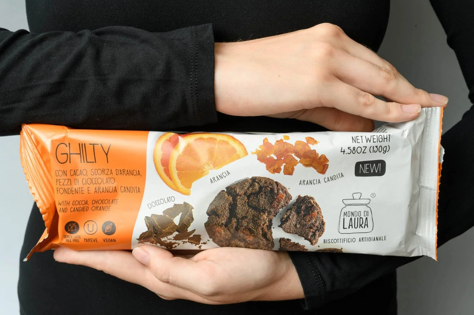 INGREDIENTI: zucchero di canna , oli e grasso vegetale ( olio di palma, olio di girasole, olio di oliva), farina di GRANO tenero tipo 0 , cacao 10%, acqua, cioccolato fondente 3,5% (min. cacao 54%, pasta di cacao, zucchero, burro di cacao, emulsionante: LECITINA DI SOIA, aroma naturale di vaniglia), scorza d’arancia candita 2,5%, agente lievitante: bicarbonato di sodio, scorza d’arancia 0,5%.